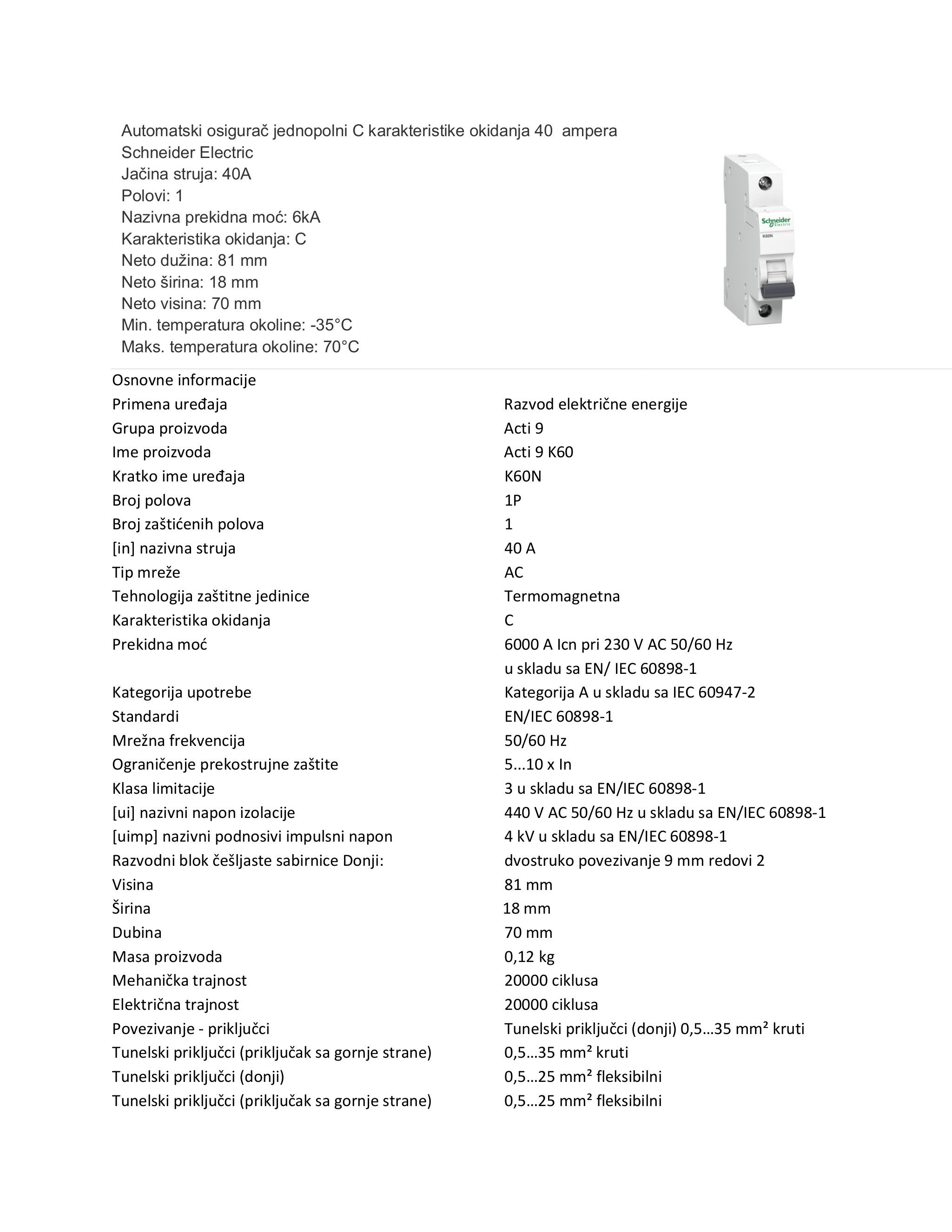 AUTOMATSKI OSIGURAČ SCHNEIDER 1P C 6kA 40A ACTI 9 K60N A9K02140